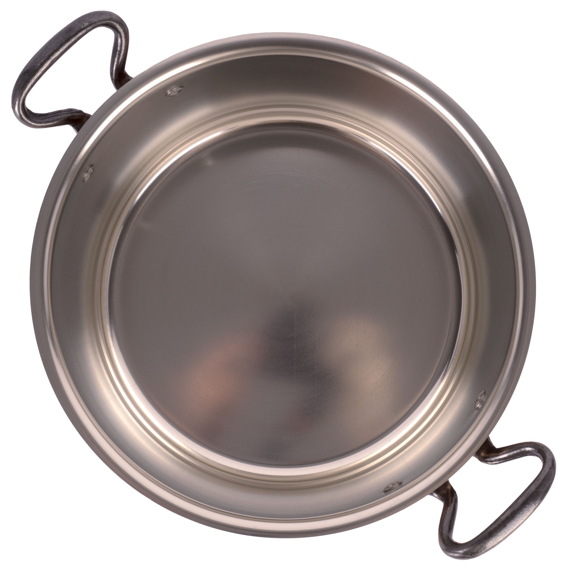 The tin-plated copper soup pot with matching tin-plated lid is formed from a solid copper disc and, without the lid, weighs 7.1 lbs. The lid itself has a weight of 1.3 lbs. The pot has a volume of 6.3 qt. The top diameter is 9.5 inches and the bottom diameter is about 8.7 inches. The height to the edge of the pot is 6.5 inches. With the cast iron handle, the tinned pot is about 13.4 inches long.