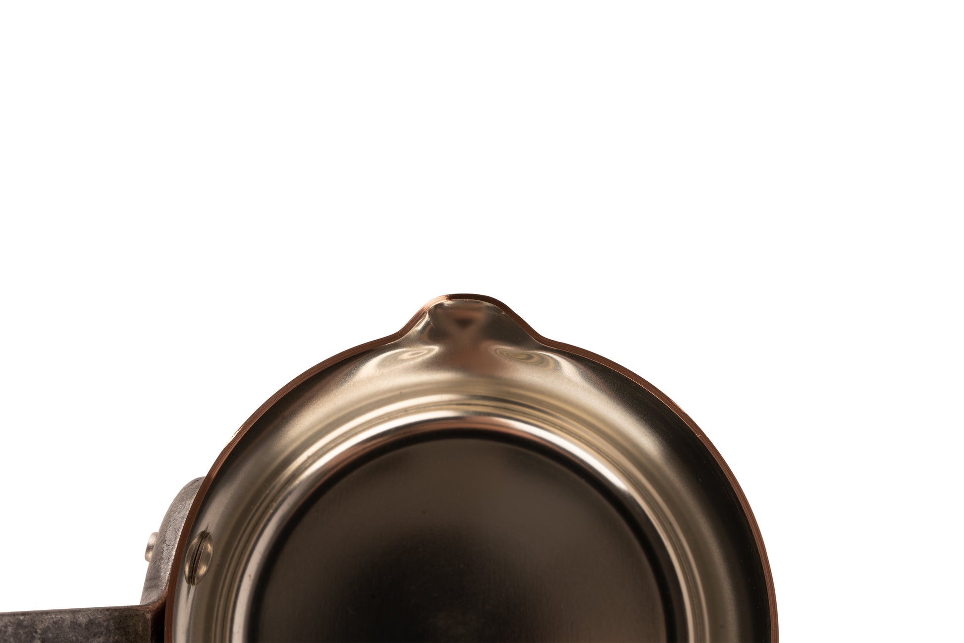 The saucière is formed from a solid copper disc and weighs 1.1 lbs. The saucière has a volume of 0.7 qt. The top diameter is 4.3 inches and the bottom diameter is about 3.9 inches. The height to the edge of the saucière is 3.18 inches. With the cast iron handle, the saucière is about 8.3 inches long.